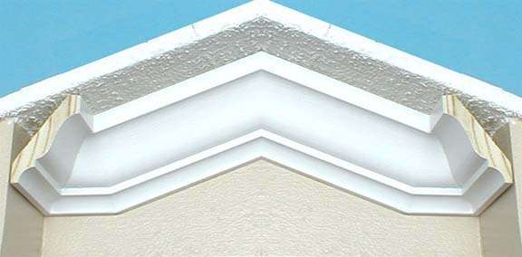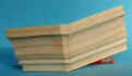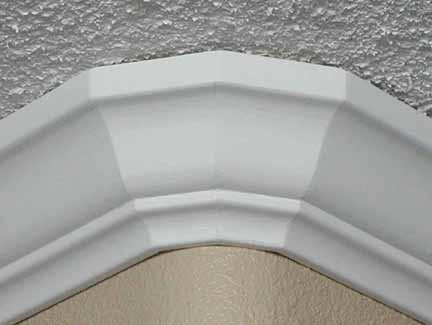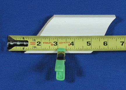 TIP: It is very helpful to glue the small wedge piece to the horizontal crown and then use the wedge piece to measure the length of the adjacent crown molding going up the slope. To glue the joints, use fast setting glue (i.e., 5-minute epoxy from your local hardware store). (Please be careful while cutting the small wedge transition piece. It is much safer cutting small pieces of crown molding laying flat instead of propped up. Also you can not cut crown molding propped up for turns in the plane of the ceiling.